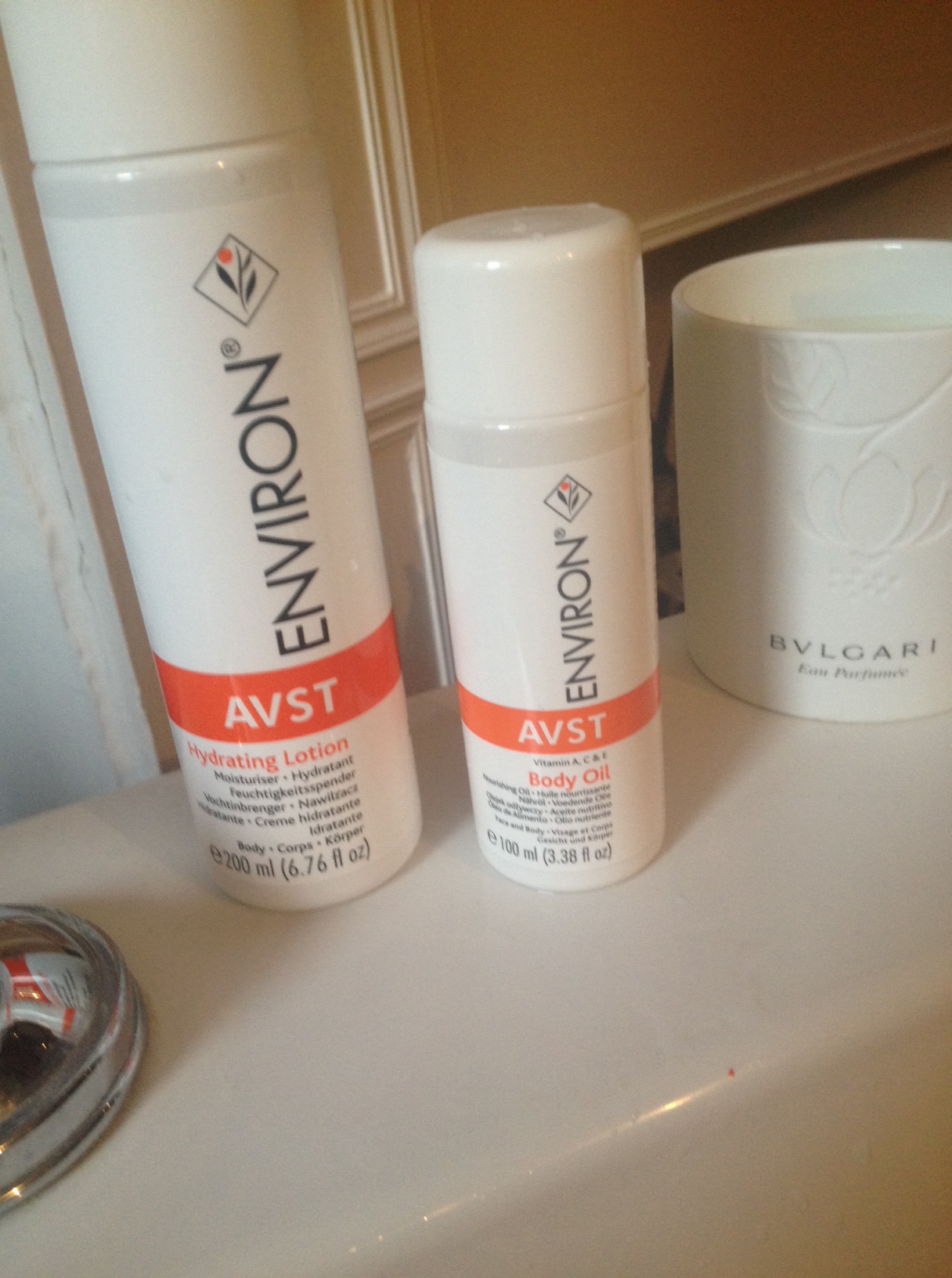 Als extraatje mag ik ook het hele lichaam met Environ insmeren. Jammer dat ze geen liter flessen hebben. Altijd weer een klusje maar als het gebeurd is, voelt mijn hele lichaam super zacht aan. Ik begin met de Hydrating Lotion uit de AVST lijn. Deze vocht inbrengende lotion is op basis van melkzuur. Het maakt de textuur van je huid gladder. Ideaal voor ruwe plekjes. Daarna smeer ik mijn lichaam in met de Vitamine A,C &E Body Oil. Dit is een heerlijke voedende niet vette lichaamsolie die de conditie van je huid onmiddellijk verbetert.