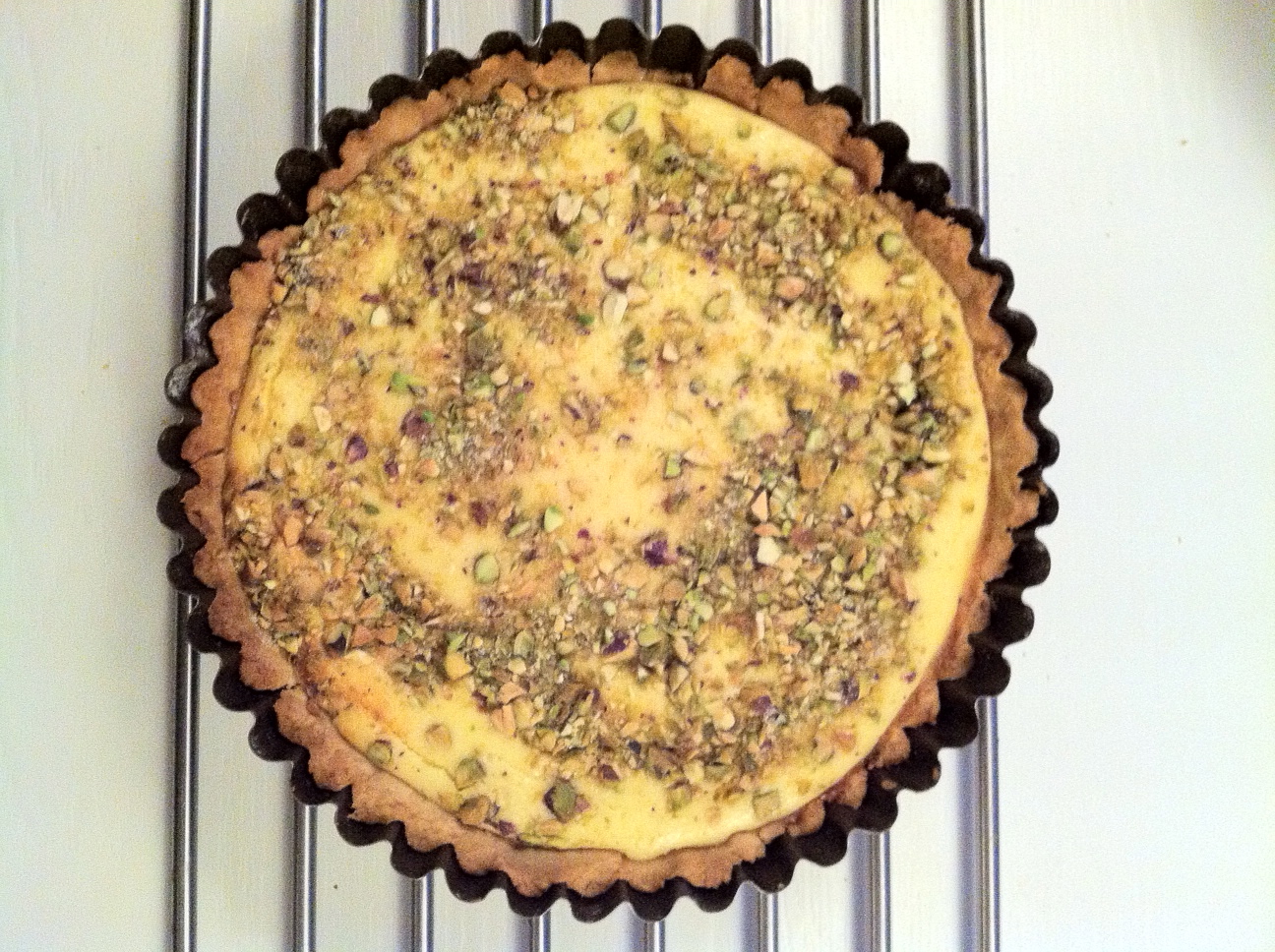 Schenk het kwarkmengsel in de taartbodem en verdeel de pistachenootjes met de suiker erover. Bak de taart gaar in de oven in 50-55 minuten. Je kunt controleren of de taart gaar is door zacht te bewegen, de vulling zal heel rustig wat mee bewegen. Met het afkoelen zal de vulling verder stevig worden.