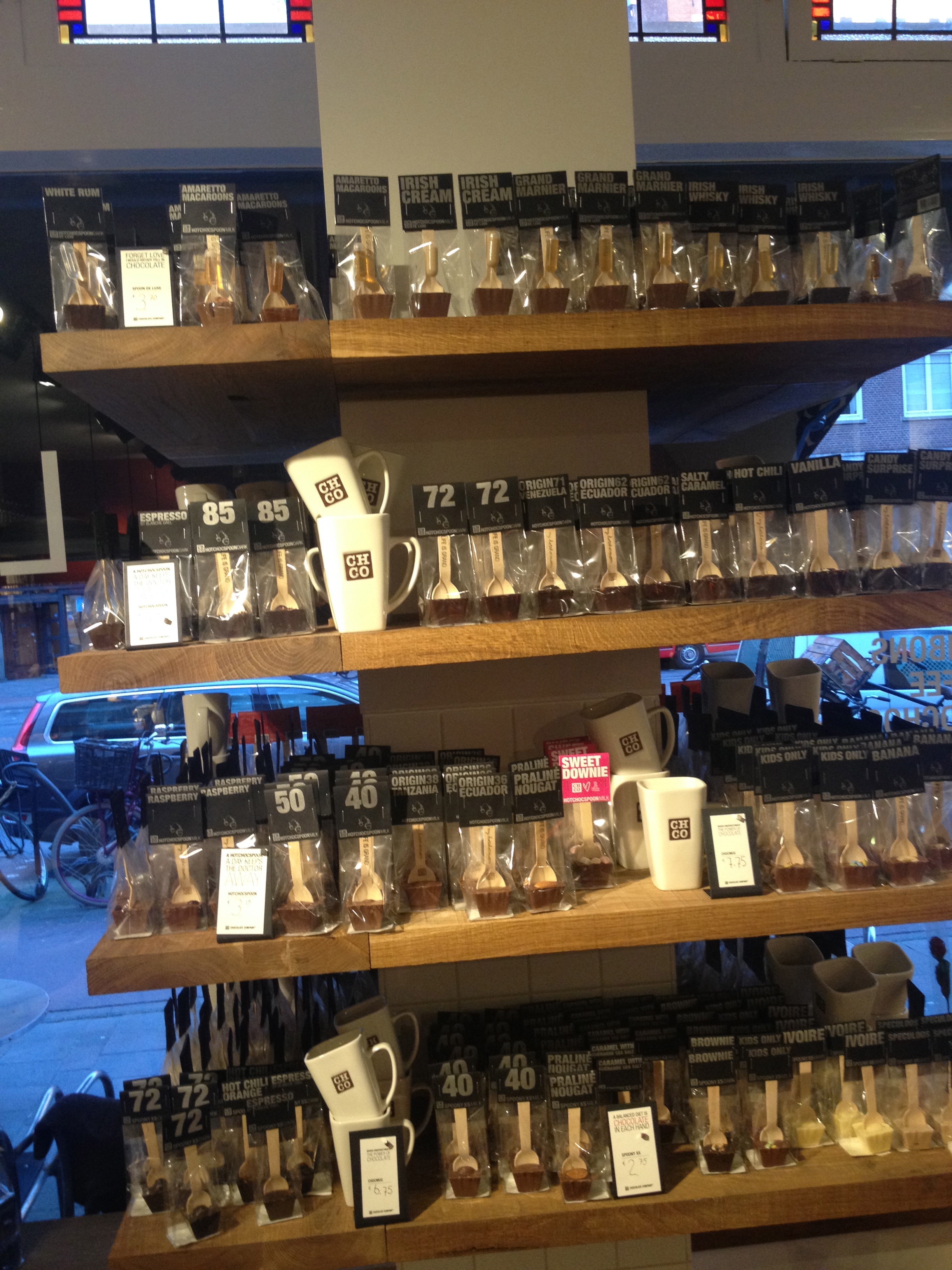 Voor de échte chocolate lovers onder ons, neem eens een kijkje in de Chocolate Company op de Rijnstraat in Amsterdam. Deze is eind vorig jaar in Amsterdam door de burgemeester himself geopend en deze chocolate experience moet je ervaren hebben. Zelden heb ik zoveel verschillende soorten chocolade gezien. Alleen al de hotchocspoon bestaat uit 70 smaken. Eigenlijk is de Chocolate Company bekend geworden door de hotchocspoon: een houten lepel met daaraan een blok chocolade die je in de hete melk doopt totdat het gesmolten is tot warme chocolademelk.Tot en met de apres ski spoon aan toe ( daar gaat nog ietwat alcohol bij).