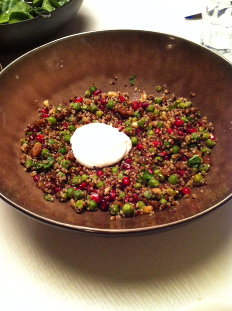 Bereid de quinoa volgens de gebruiksaanwijzing op de verpakking. Kook de doperwten in water met zout in 6-8 minuten beetgaar. Rooster de pijnboompitten goudbruin in een droge koekenpan. Meng de quinoa, doperwten, linzen, granaatappelpitjes, rozijnen, pijnboompitten en peterselie door elkaar.
