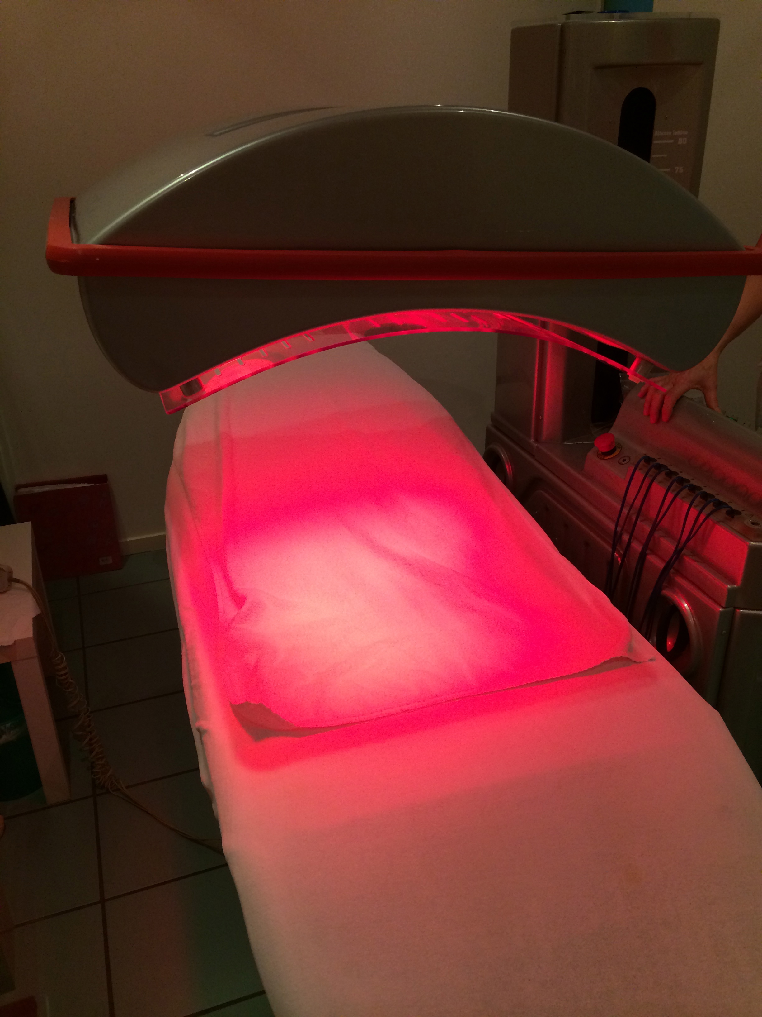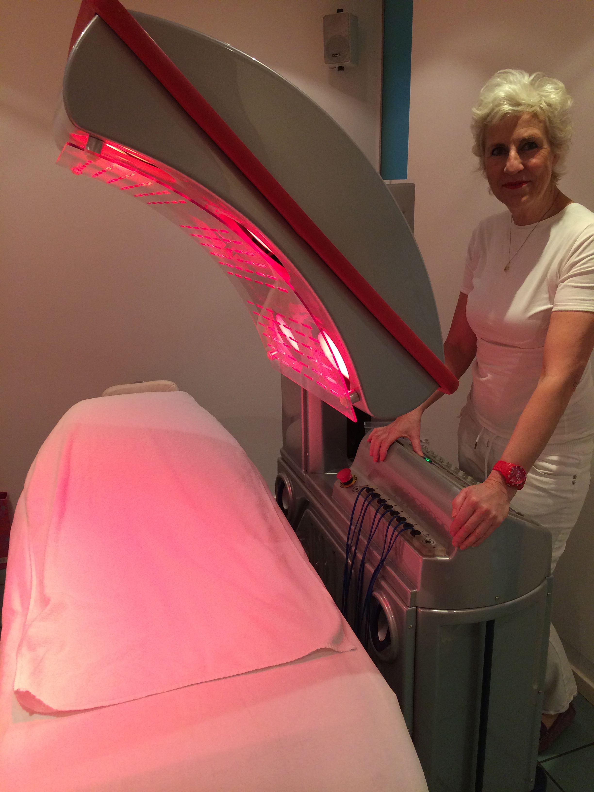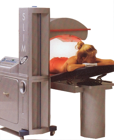 Dit apparaat beloofd een verbetering van mijn contouren maar ook een vermindering van mijn omvang. Het werkt op electro stimulatie in combinatie met infra rood warmte. En dat is nou net zo lekker want als je je ogen dicht doet waan je ook nog eens onder de zonnebank. Niet dat mijn huid er enige kleur van kreeg maar de infraroodstralen dringen door tot je diepere weefsellagen en dat stimuleert de doorbloeding weer en verhoogd mijn stofwisseling. Dat kan ik naast strakker worden ook goed gebruiken. Wie weet volgt de combinatie Slim Up met de ingebouwde hoogtezon in 2015?