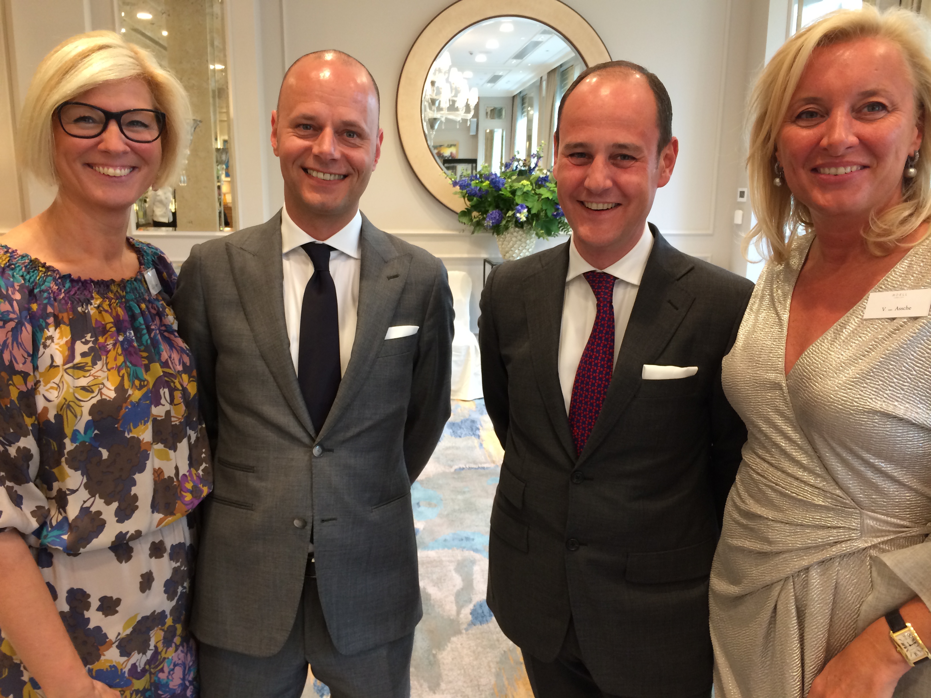 De heren samen met hun twee lieftallige Belgische medewerkers in het prachtige Waldorf Astoria Hotel in Amsterdam. De dames hadden het er maar druk mee om alle juwelen uit de vitrine te halen en bij iedereen om te hangen.