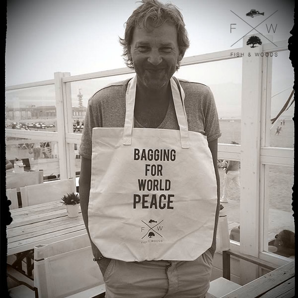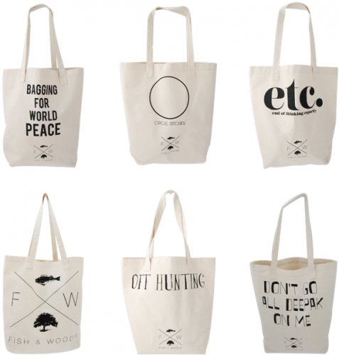Vroeger waren canvas tassen in mijn ogen heel nerdy maar tegenwoordig zijn ze in de modewereld helemaal hot. En niet alleen in de fashion wereld, ze zijn ook very grachtengordel, glamorous & student-like. Fish & Woods creëerde deze tassen met humoristische statements als: Don’t go all Deepak on me en Bagging for world Peace. De shopper is praktisch, sterk, goedkoop en het mooie is aan dit Amsterdamse tassenmerk, dat de modellen niemand minder dan zwervers zijn.