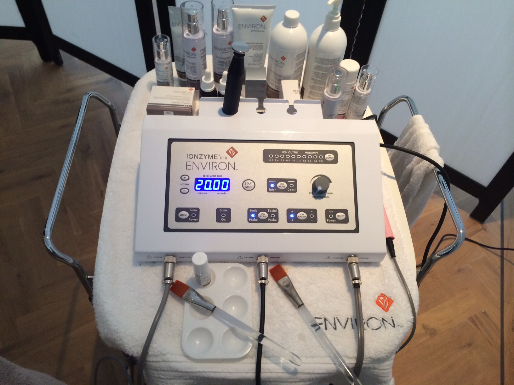 Dit is het Ionzyme apparaat wat dmv electro en geluidsgolven enorme wonderen met de huid kan verrichten. Het gebruik van dit apparaat is een cruciaal onderdeel van een Environ behandeling omdat de huid een natuurlijke waterdichte barrière heeft. Dit high- tech Ionzyme apparaat zorgt er dus voor dat ingrediënten als vitamines in de huid worden gepenetreerd. Of via elektrostroom of via geluidsgolven. De huid sluit vanzelf weer na de behandeling.