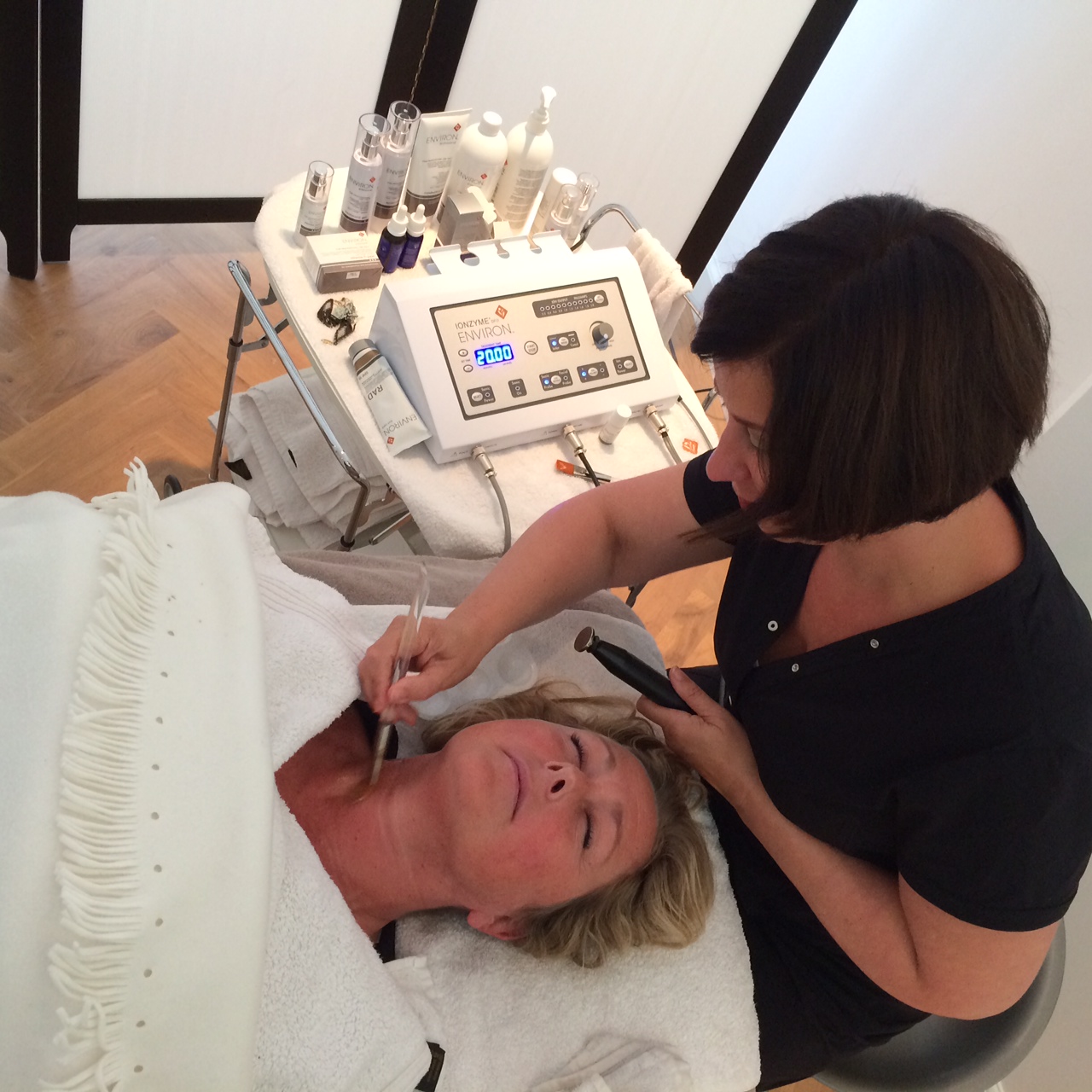 In een geweldige pop-up Spa in Amsterdam west, werd mijn hals eerst grondig gereinigd en daarna werd de vitaminecocktail (Focus Hydrating Serum ) uit de Environ lijn dieper in de huid opgenomen dankzij het gebruik van het Environ Ionzyme DF apparaat. Dit is een heel hoog geconcentreerd vochtverzorgend serum die de droge huid, fijne lijntjes behandeld. Tevens pakt het ook het door zonlicht beschadigde huid aan. Dit (pijnloze) apparaat werkt met elektrostroom en geluidsgolven. De lage frequentie geluidsgolven zorgen ervoor dat de werkzame stoffen van het product heel diep de huid binnendringen. Ik hoorde wel een fel gemeen piepje tijdens het behandelen maar dat gaf aan dat het serum diep door alle huidlagen ging. Het resultaat mocht er zijn, een veel vollere en stevigere huid.