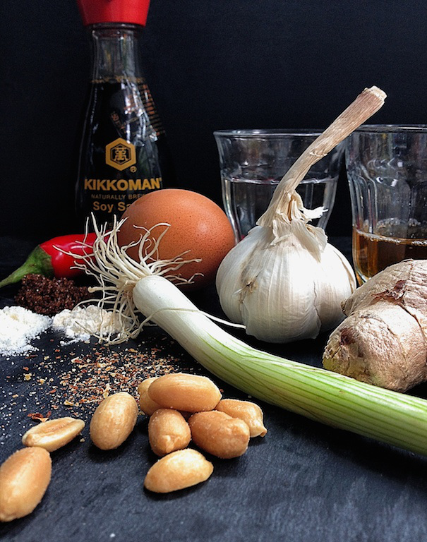 3. Voor de chili saus doe je de gember, bruine suiker, fijne suiker, soy saus en cider azijn in een steelpan en verwarm op matig vuur. Breng aan de kook en laat, met af en toe roeren, 15 minuten zachtjes pruttelen tot de saus dikker wordt. Voeg de chili vlokken en pinda’s toe. Laat nog even 5 minuten pruttelen. Zet apart om af te koelen.