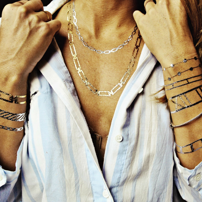 De tijdelijke tattoos komen in allerlei vormen en zijn in zilver, goud en zwart verkrijgbaar. Je kunt ze overal plaatsen, zoals op je enkel, pols of nek. Alsof je echte sieraden draagt. Deze Flash tattoos zijn makkelijk aan te brengen en blijven 4 tot 6 dagen zitten. Je moet er natuurlijk wel voorzichtig mee zijn, dus even geen zeep, bad of body olie gebruiken.