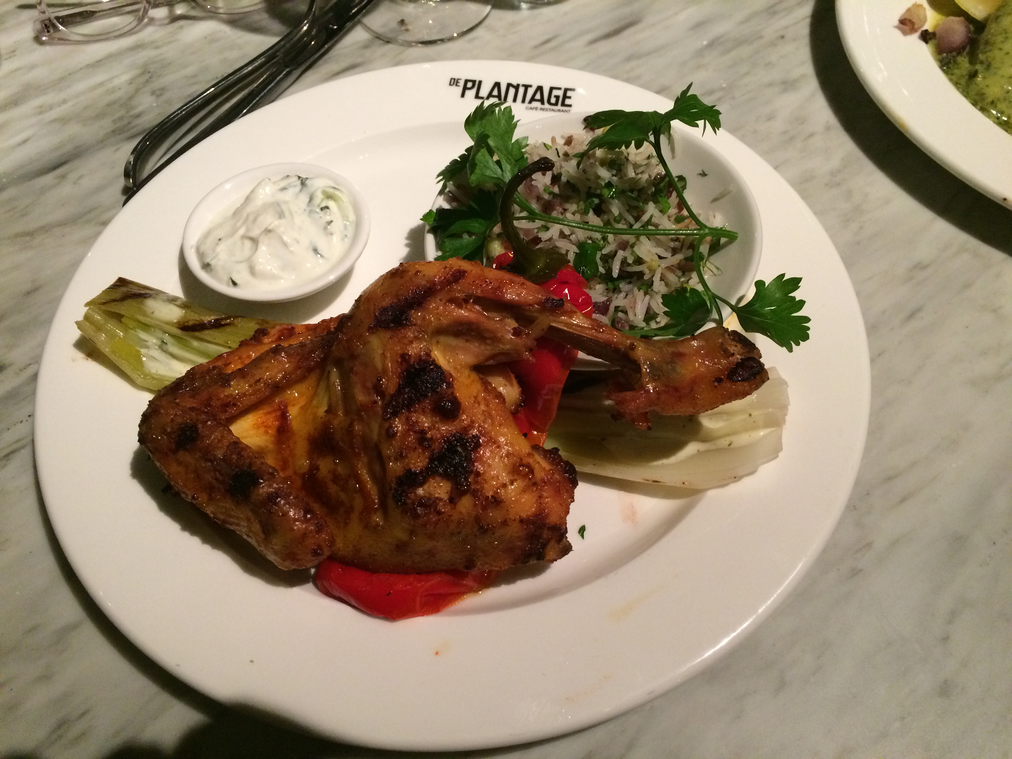 Wij bestelden als voorgerecht de oesters en de carpaccio van aubergine. Ze hadden de aubergine plat geslagen en gepeld terwijl hij nog wel een crunchy bite had. Zeker een aanrader. Als hoofdgerechten hadden we een bavette ( deel van een koe) met laurieraardappel en een heerlijke saus. En de Coquelet Pimenton, een haantje wat werd opgediend met tzatziki en Perziche pilavrijst. Voor de kinderen is er geen speciaal menu maar wij hebben onze kinderen aangeleerd om altijd mee van de kaart te eten. Toen ze er ook heerlijke frietjes bij kregen, waren ze helemaal tevreden. Totdat een van de kinderen zich hardop af vroeg of het haantje niet uit Artis kwam??