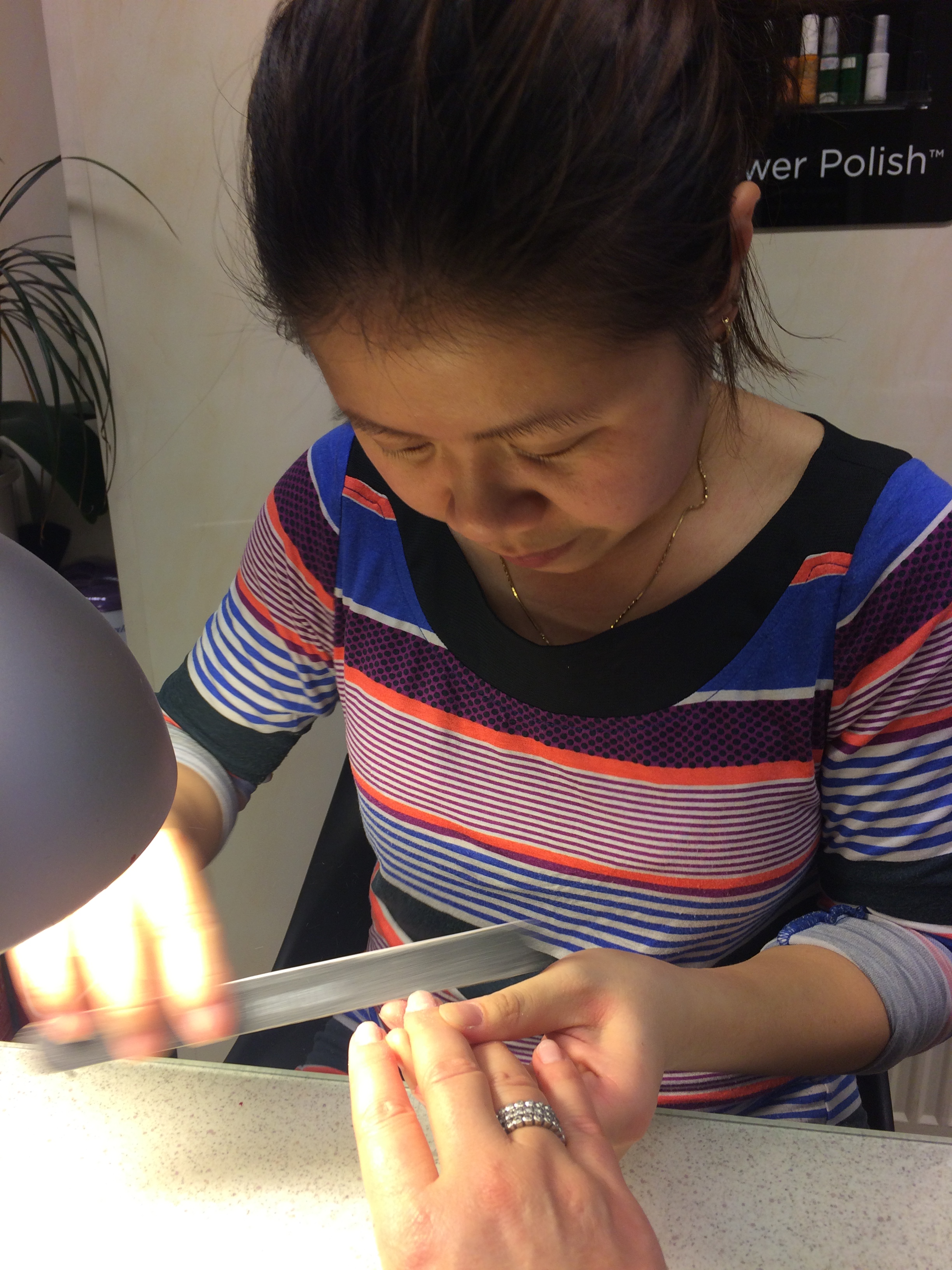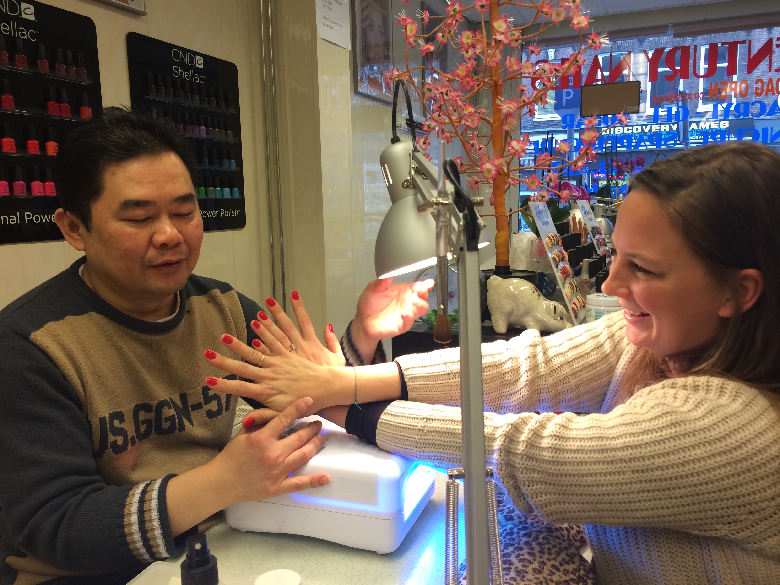 De nagelstyliste op de foto hieronder is Yen. Zij doet mijn nagels al jaren en door haar heb ik inmiddels mooi verzorgde en tevens (voor mijn doen) lange nagels. Nu ik er Shellac op heb, weet ik dat mijn nagels minimaal 3 weken prachtig blijven. Geen chipje eraf niets, het enige is dat je na een paar weken een soort van uitgroei ziet.