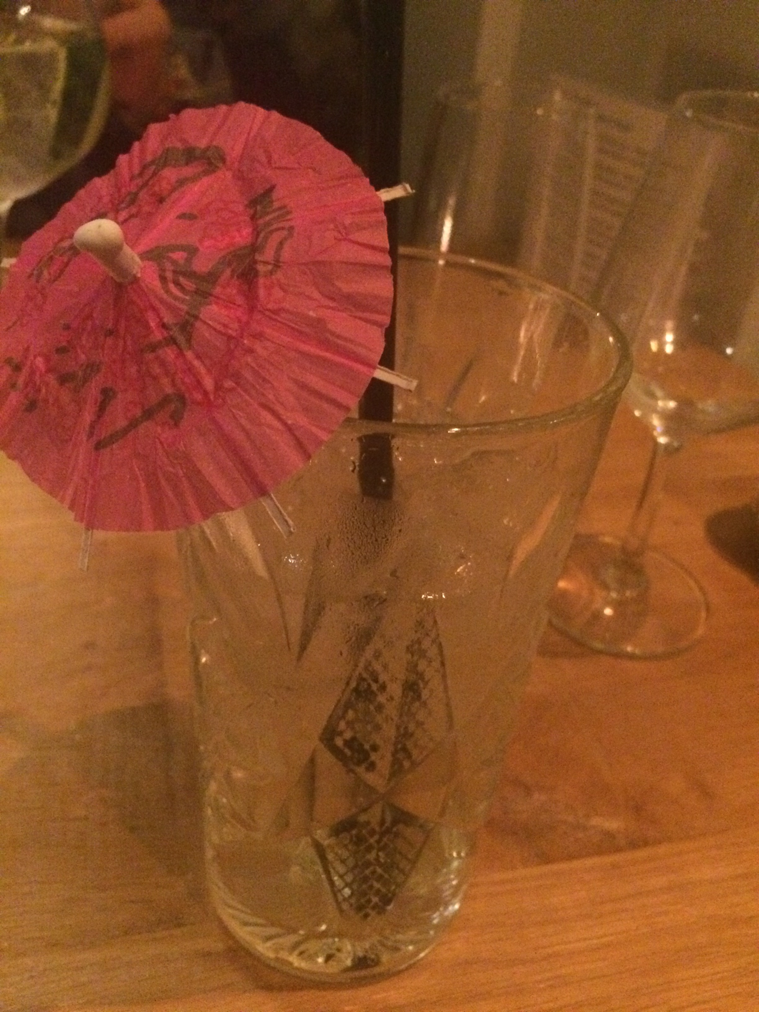 Het restaurant zat bomvol, met heel hip publiek ( alle mannen met nóg steeds een baard) en naarmate de avond vorderde, ging het muziek tandje harder en de lichten in de dim stand. Wij ontdekte de G&T kaart te laat dus na het eten hebben we er toch nog maar eentje besteld. Het vlees was zwak. Sven ( de oude barman van Le Garage) dé G&T kenner bij uitstek maakte voor mij een speciale G&T. Jammer dat ik niet gevraagd heb wat er in zat, want ik voel hem namelijk nog steeds. Je kunt kiezen uit tien verschillende soorten G&T’s.