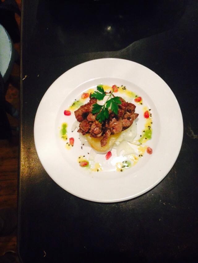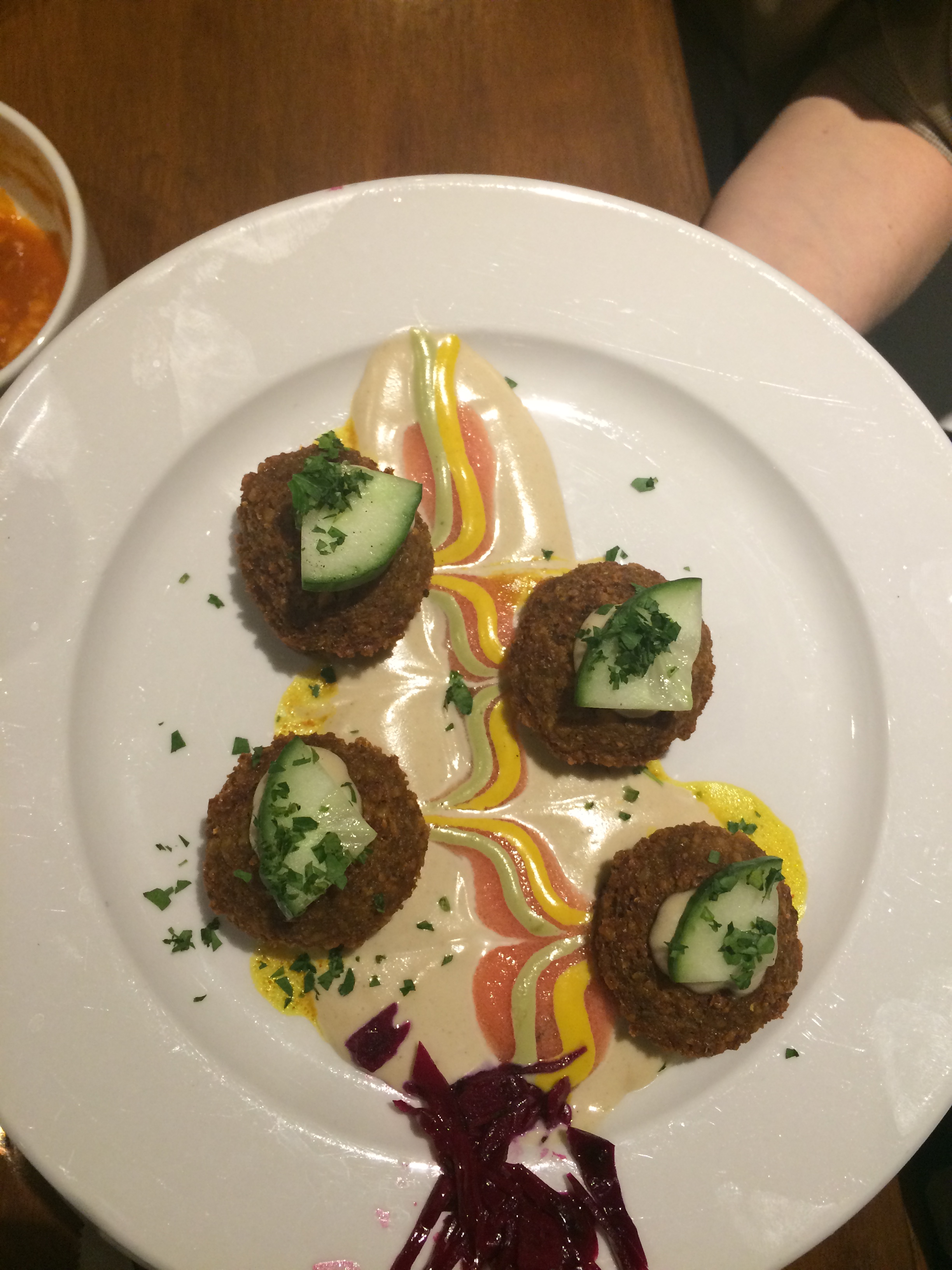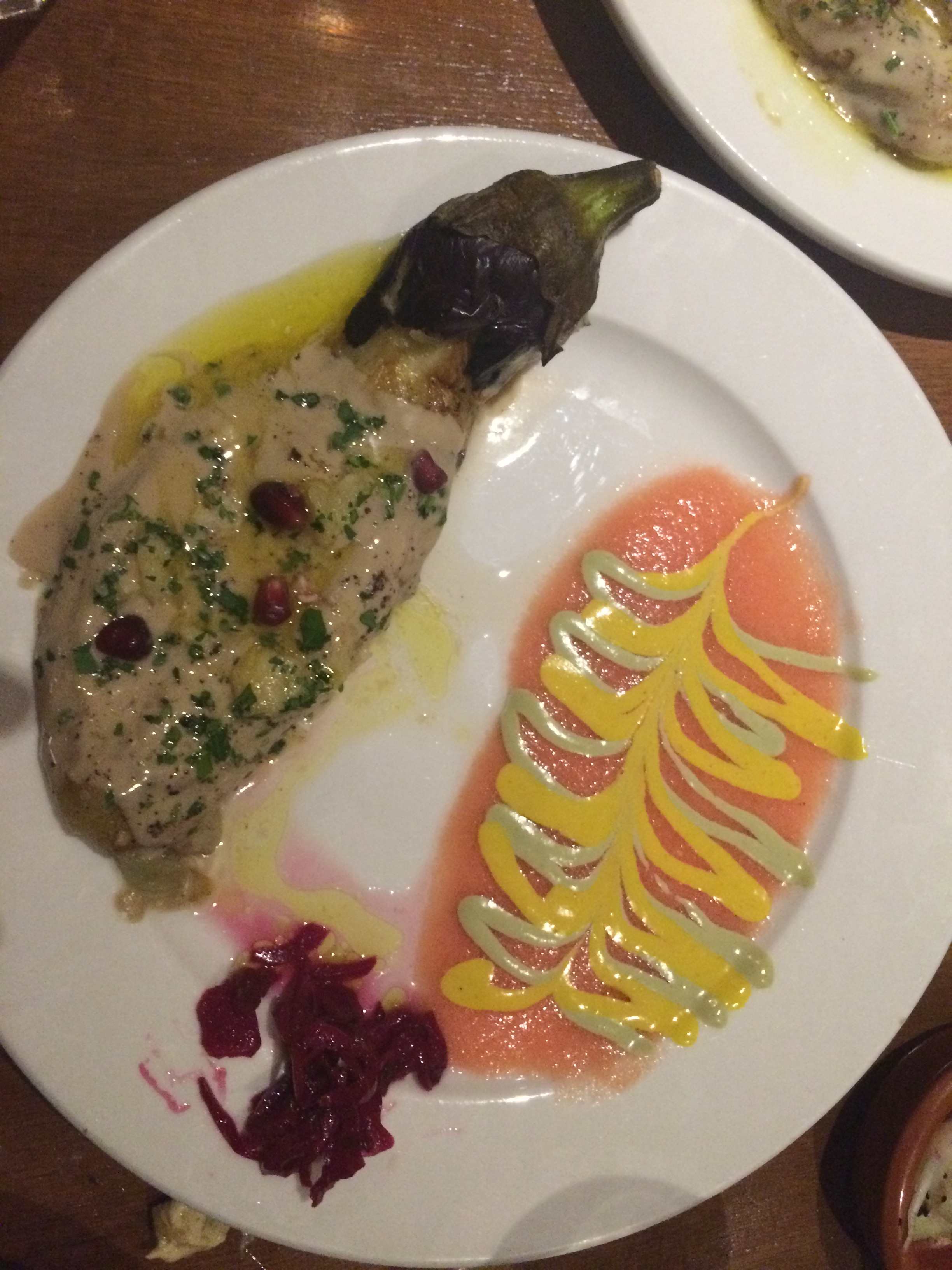 Deze falafel balletjes waren heerlijke knapperig en lagen in een saus van hummus en tahin. Ze waren smeuïg en kruidig, helemaal zoals het hoort. Op onderstaande foto de gepofte aubergine met tahin en granaatappelpitjes. Zo zacht gegaard dat het smelt op je tong. Als nasmaak proef je nog iets van het roosteren van de aubergine, beetje het bbq gevoel.