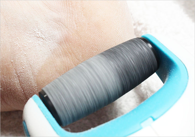Omdat ik al wel mijn rechtervoet eelt vrij kon maken, ben ik thuis al aan de slag gegaan. Het apparaatje werkt heel simpel. Je zet hem aan ( hij werkt op batterijen) en de diamantkristallen doen meteen wonderen. Ze verwijderen de droge huis en eelt in alle zachtheid zodat je voeten in een oogwenk heerlijk zacht aanvoelen. Je kunt de rollers aanschaffen in 3 schuurniveaus. Regular- extra grof of extra fijn zodat je je verzorging kan afstemmen op jouw voetjes.