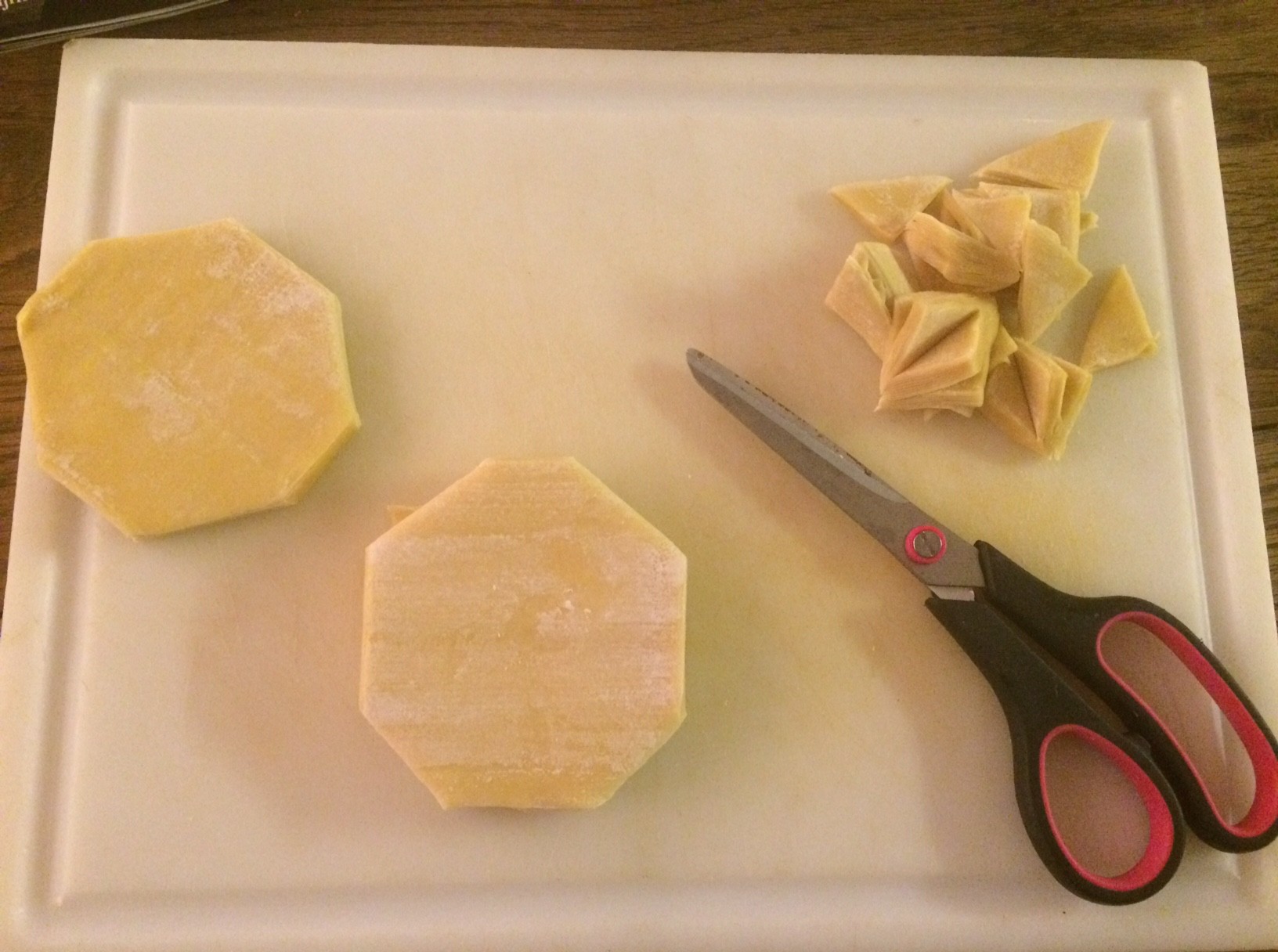 Ik knip eerst de hoekjes van de wonton velletjes af zodat je er beter pakketjes van kunt maken.