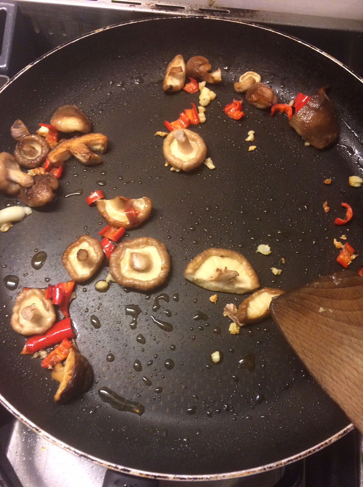 Daarna haal ik de gamba’s uit de zak en spoel ze af met koud water en ik laat ze in het vergiet uitlekken. De knoflook, rode peper en shi take bak ik in de olie en laat het afkoelen.