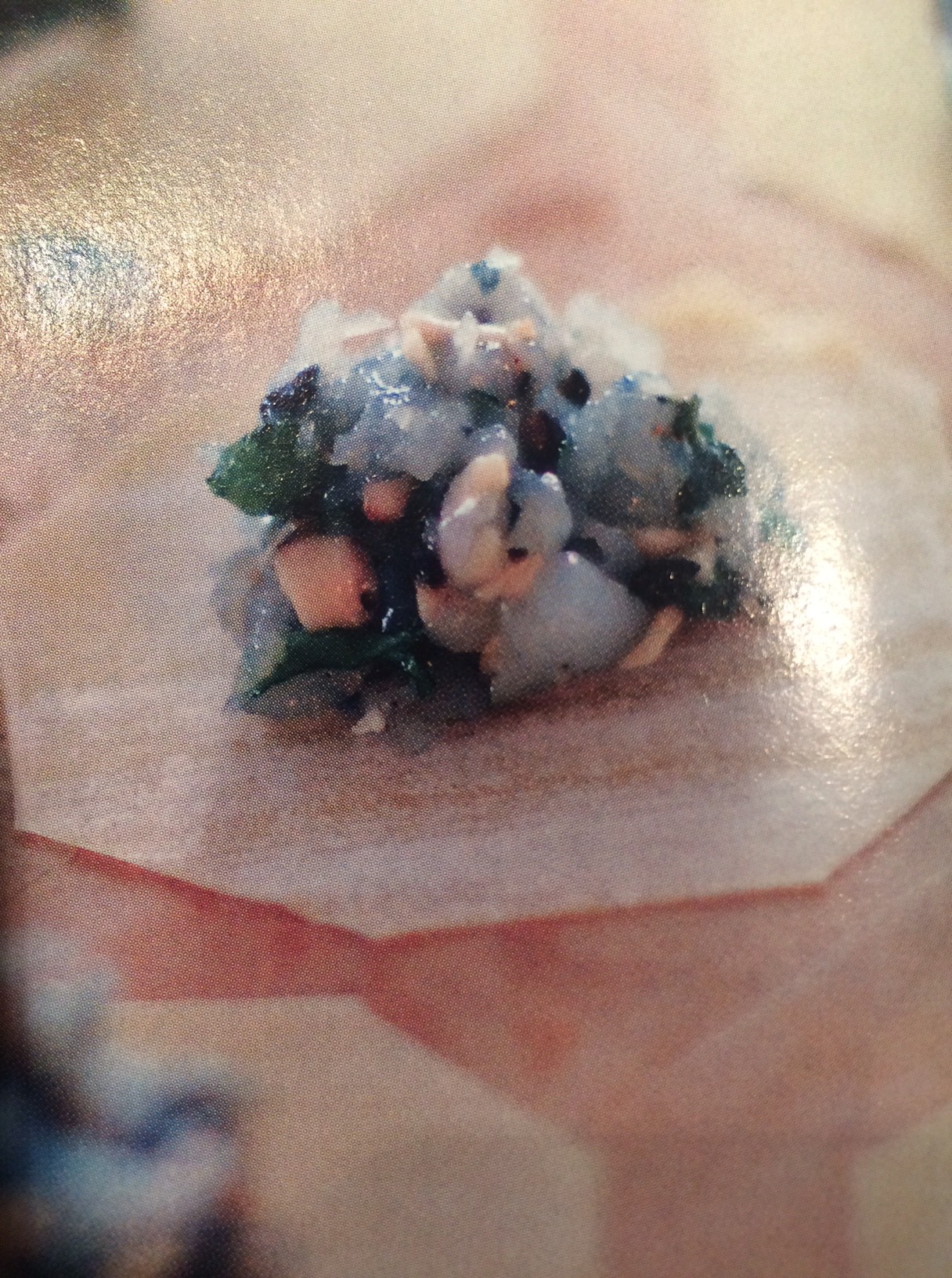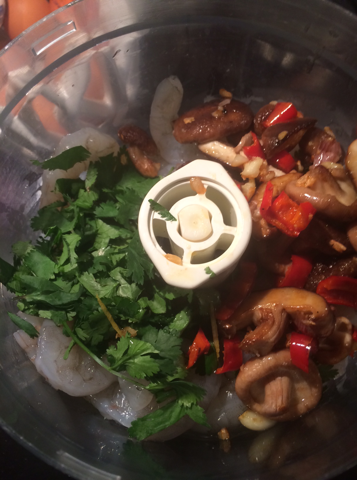 Dan gooi ik dit alles samen met de gamba’s en het shitake mengsel, het eiwit, de citroenrasp en de fijn gesneden koriander in de Magimix en laat ik het een paar tellen draaien om de boel grof te hakken. Ik breng het op smaak met zout en peper.