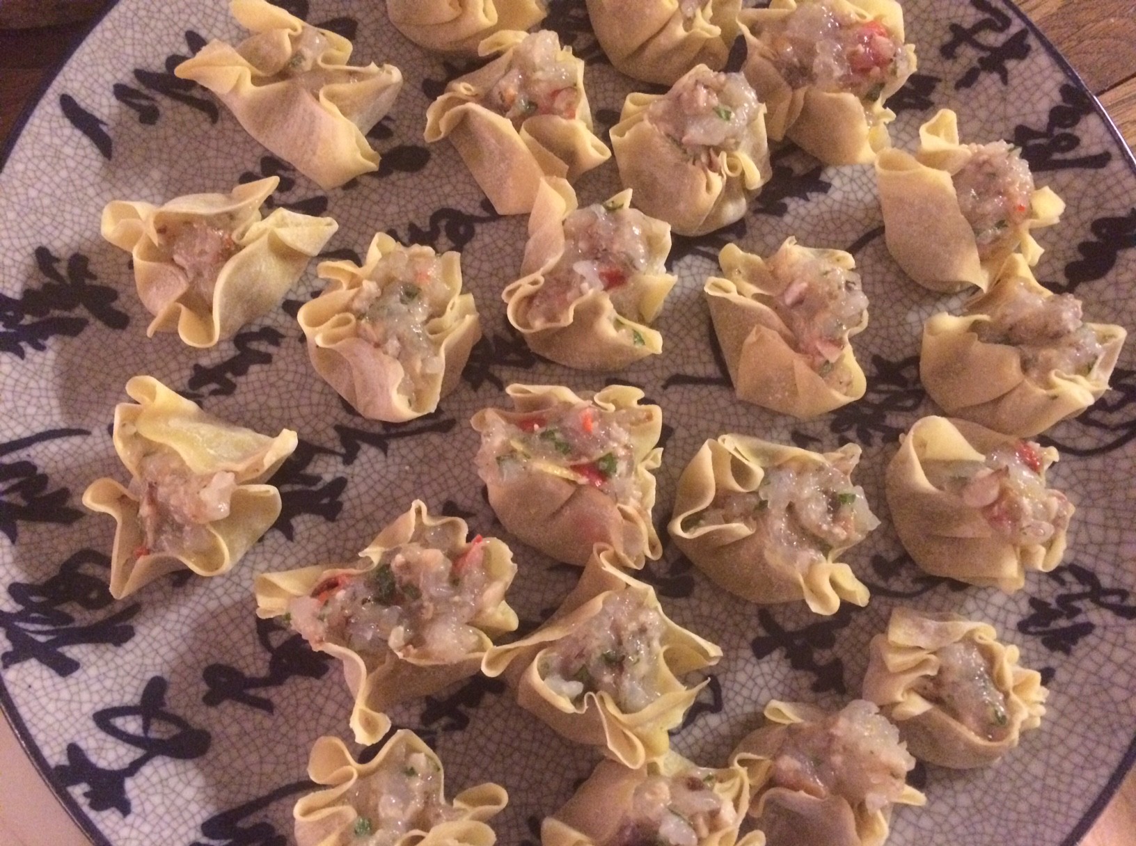 Op ieder wonton velletje schep ik een kleine eetlepel van het gambamengsel. Hoe? Je maakt een losse vuist, en leg er telkens een wonton velletje op. Druk dat naar beneden zodat het een open pakketje wordt met een goed zichtbare vulling.