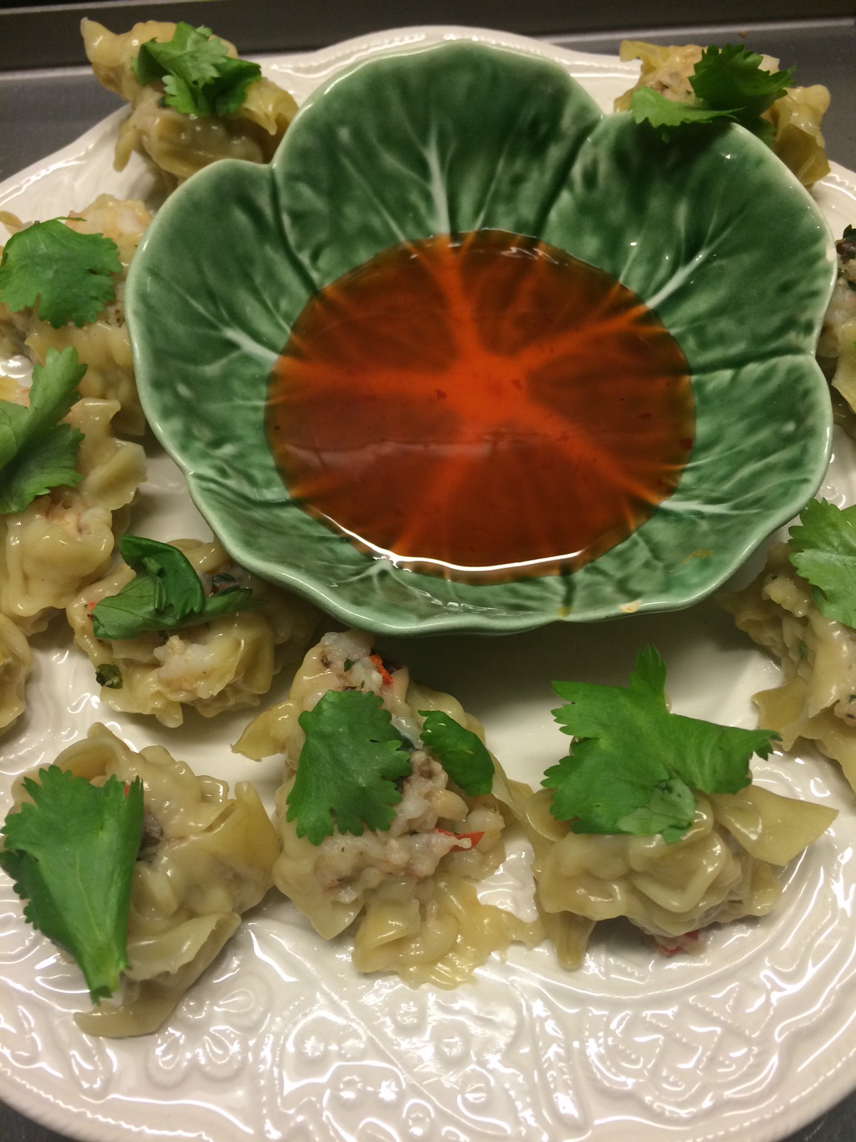 Ik zet ze altijd op een bord en hou ze koel in de ijskast tot het borrel moment aanbreekt. Niemand zal er in de tussentijd van snoepen want rauw zijn ze echt niet te eten. Stoom ze in 7 tot 8 minuten gaar ( zowel in stoomoven als in het mandje). Daarna bedek ik de bovenkant nog met een koriander blaadje maar speciaal voor de koriander haters maak ik er ook altijd een paar zonder.