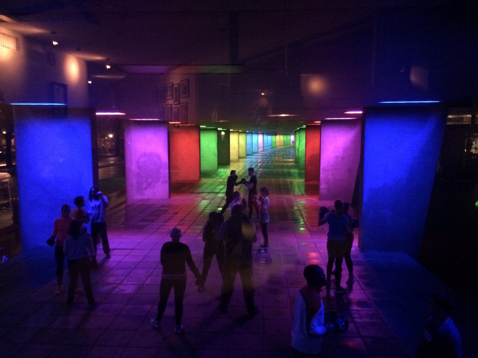 Hier hebben we heerlijk gegeten. Het ligt schuin tegenover Boymans van Beuningen aan een overdekte soort van galerij vast. Iedere minuut kregen we nieuwe kleuren te zien. Terwijl wij er een heerlijke biefstuk met frites naar binnen schoven zagen we personal trainer Tony ( schat hem zo 120 kilo) bokslessen geven aan Rotterdamse moedertjes.