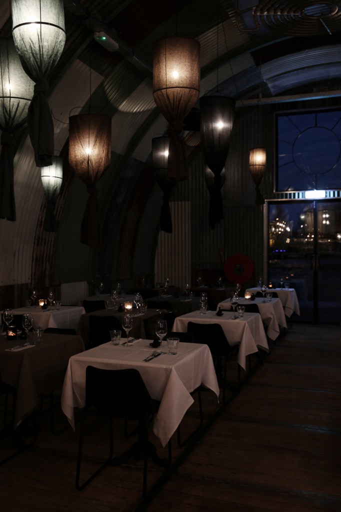 De loods/ hangar waarin wij aten, is vanuit het niets opgebouwd en staat pal naast het restaurant de Goudfazant. De Hangar is opgebouwd met groene en witte golfplaten, waardoor je meteen dat Piet Hein Eek gevoel krijgt. Het restaurant oogt van binnen als ruig en stoer, een beetje zoals Amsterdam Noord, moeten de oprichters acteur Tim Immers ( founder van Bar Moustache) en Jop Pollman gedacht hebben. Dat intieme sfeertje van Bar Moustache is nergens te vinden, maar toen uiteindelijk alle tafeltjes vol waren en wij de lichtjes aan het IJ aan de overkant zagen fonkelen en de vrolijke gekleurde Marokkaanse lantaarns boven ons hoofd zagen schemeren, zaten wij er best heel intiem met z’n achten.
