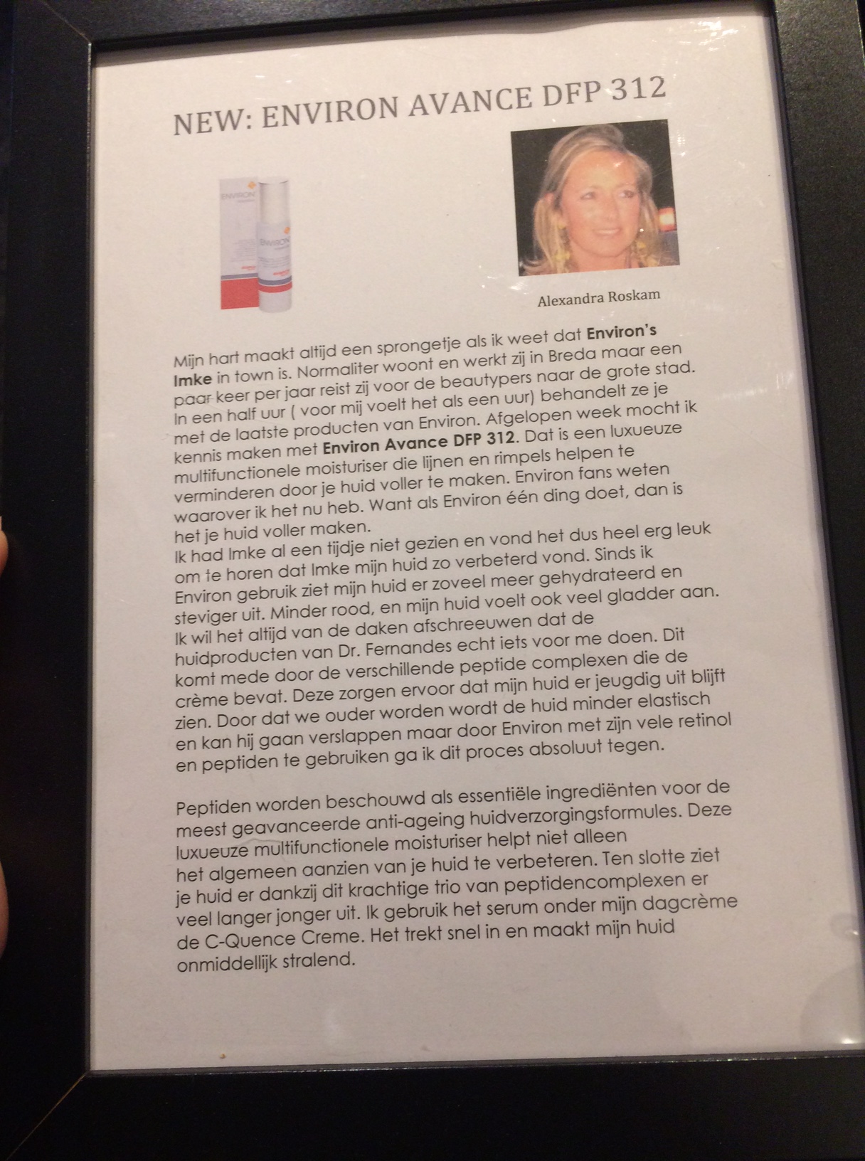 Terwijl ik een steeds meer over dit beauty merk leerde, woonde Alexandra met man en kinderen in Nicaragua. Zij wist op afstand wel dat ik een grootgebruiker was geworden maar niet dat ik er via dit blog heel enthousiast over schreef. Haar verbazing was dus groot, toen zij terug in Nederland ging wonen, en een schoonheidsspecialiste Pure SB Cosmetics bij haar in de straat ontdekte waar eigenaresse Susanne van Driel met Environ werkte. Ze viel pas écht van haar stoel af toen ze in aan de muur bij deze schoonheidssalon een uitgeprint beauty blog met een foto van mij herkende. Waarin ik weer heel enthousiast over Alex en haar prachtige huid in combinatie met Environ vertelde. Volg je het nog? En nu twee jaar later lag ik zelf in de stoel. Dan is de cirkel toch rond?