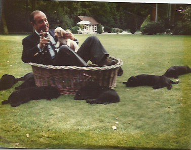 Hierbij nog een foto van de allerleukste vader. Zoals je ziet niet tussen de teckels maar tussen een nestje labrador pups. Ook daar was hij een groot liefhebber van. Dank voor alle mooie herinneringen die je hebt nagelaten..