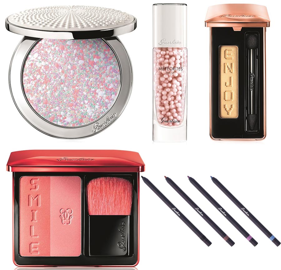 De Guerlain collectie heet Spring Glow. De meeste producten uit deze lijn zijn dan ook bedoelt om glans te geven. Het begint al bij de basis met de Météorites Base. Dit is een prachtige glazen flacon gevuld met parels in een doorzichtige vloeistof. De parels bevatten ingekapseld diamantpoeder.