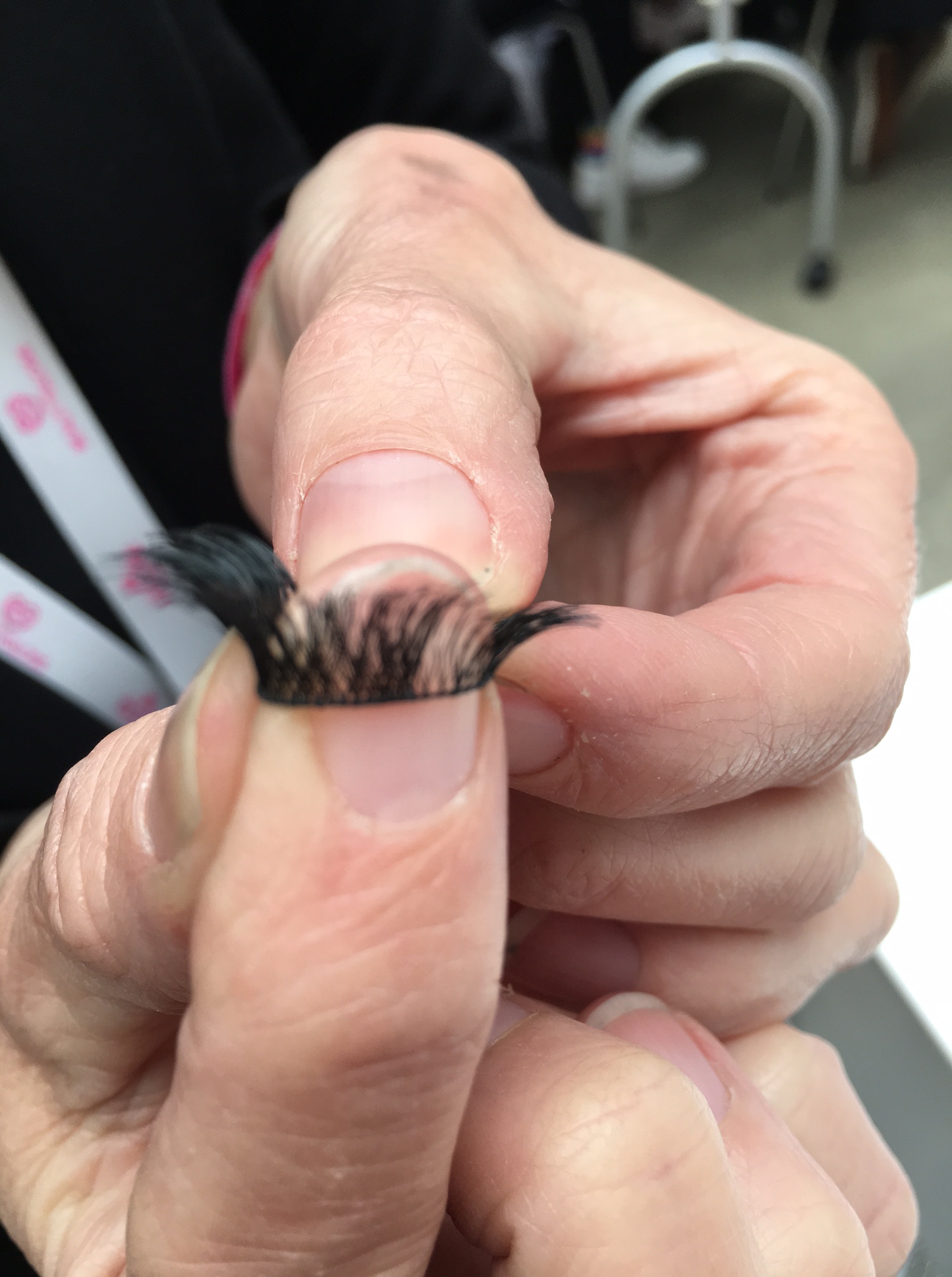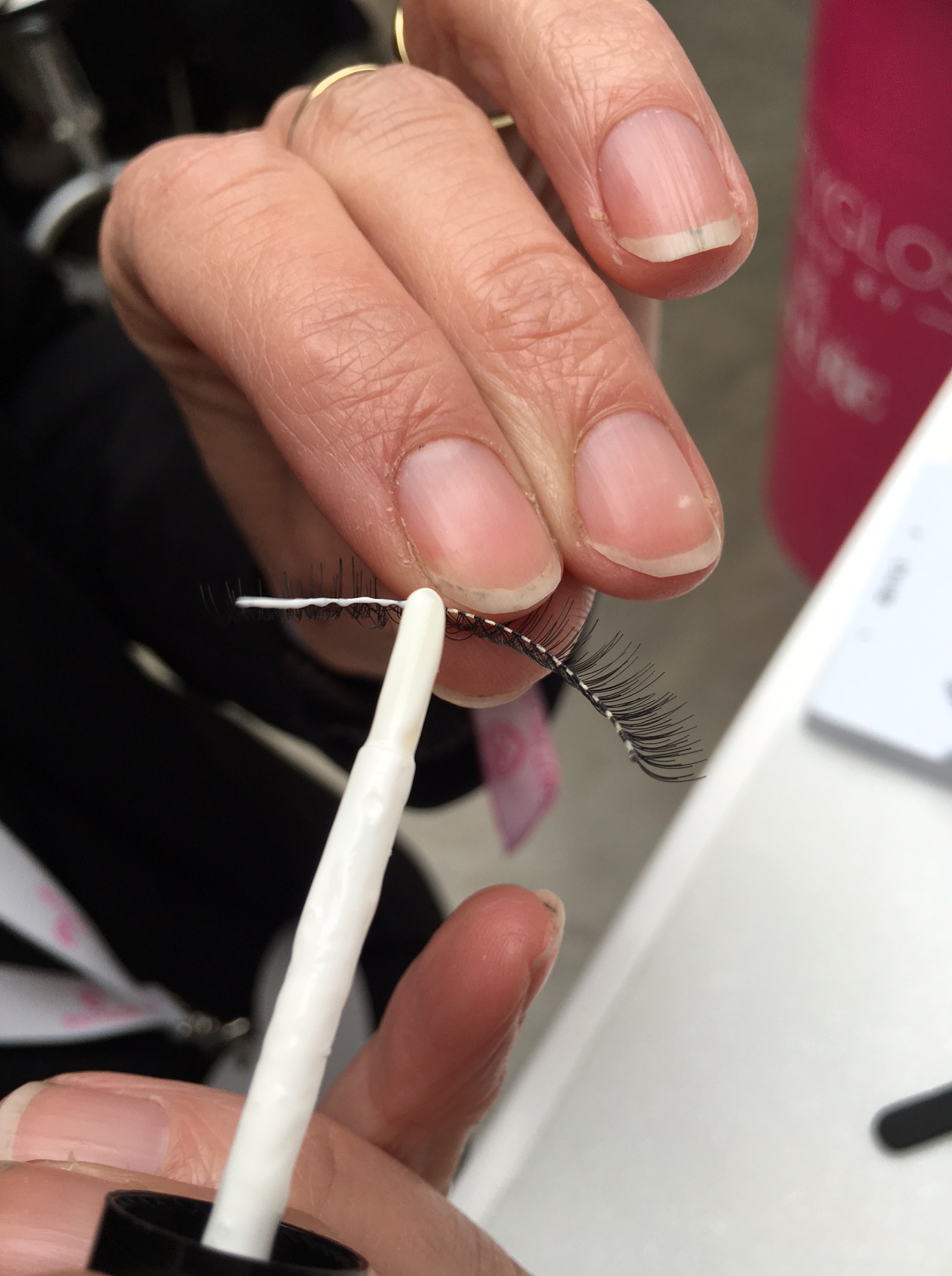 Hier brengt de mevrouw wat lijm aan op de wimperrand. Even 10 seconde laten drogen.