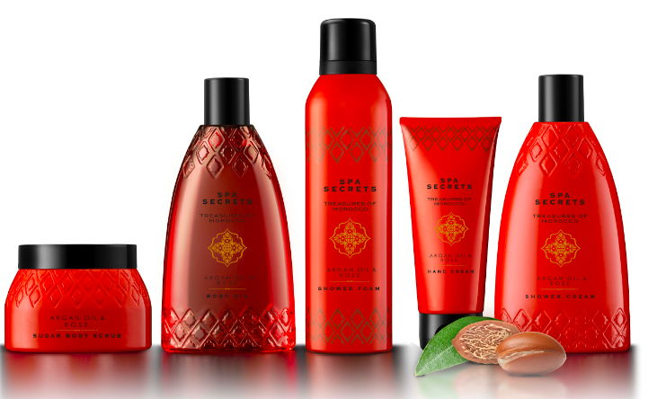 Deze ‘rode’ collectie is het paradepaardje van de Spa Secret lijn, mede omdat ze denken dat dit de geur is die de meeste vrouwen zal aanspreken. Hij is warm, zacht maar ook heel ‘parfum-achtig’. Deze collectie laat je de ‘schatten’ van Marokko beter kennen en rijke ingrediënten zoals arganolie en rozenwater. Parfum, Arganolie, Rozenolie en Rozenextract zijn de belangrijkste ingrediënten. De scrub is mijn favoriet. Die hoort verplicht naast je bad te staan, zo fijn.