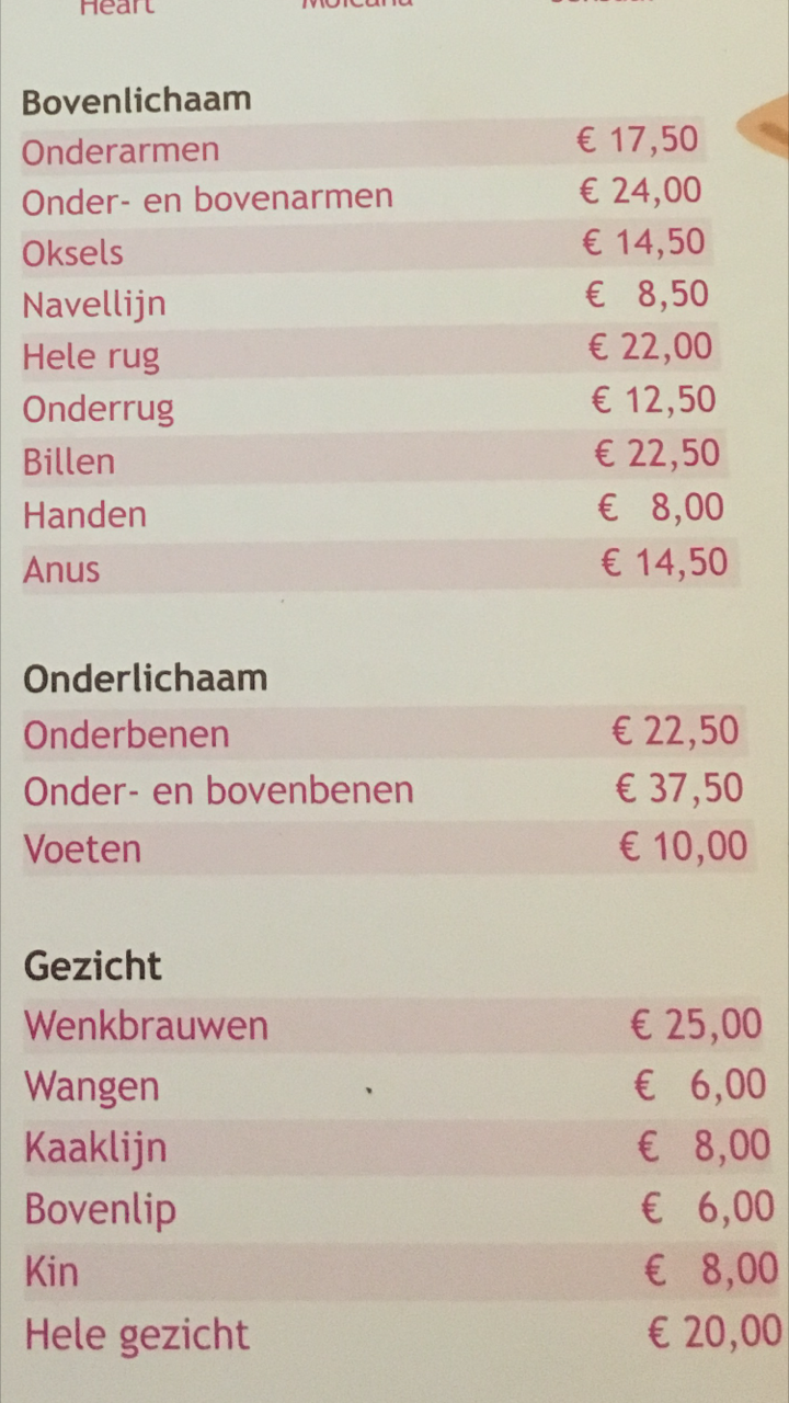 Hieronder de menu kaart: ze zijn dus echt gespecialiseerd in de Brazilian wax. Het was er ook super druk. Ze hebben rond de 9 behandelkamers en deze waren allemaal vol. Ik begrijp ook wel waarom, want de prijzen liggen vele malen lager dan bij andere salons.