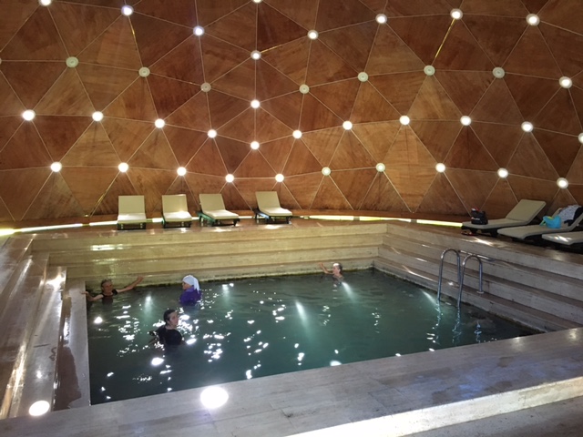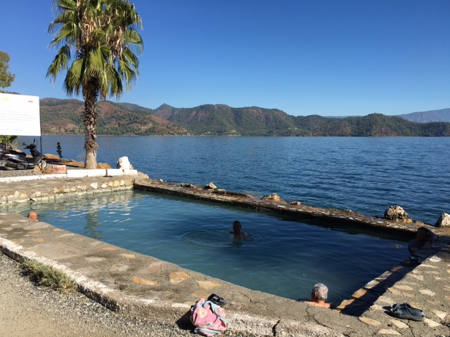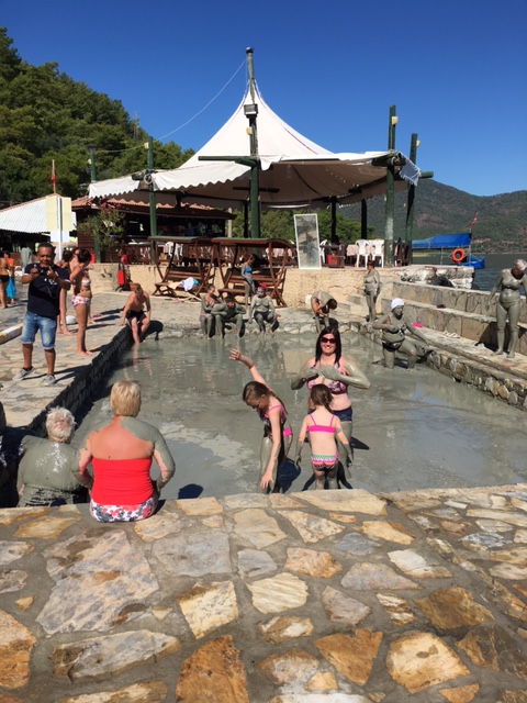 We smeerden elkaar lekker met modder in. Echt een hele rare gewaarwording om in de modder weg te zakken. Daarna ga je een half uurtje in de zon zitten zodat elke porie in je huid de modder kan absorberen. Ik was zo blij dat ik uiteindelijk het meer in mocht springen. Viezer dan dit heb ik me nog nooit gevoeld. Daarna doken we nog even 10 minuten in het zwavelbad en ondanks dat het niet lekker rook, voelde je de helende werking op je huid. Deze zwavel reinigt je lichaam ook en versneld zelfs de heling van wondjes, eczeem, huidziektes, reuma en verkalking. Er zijn zelfs mensen die deze zwavel drinken want dan helpt het tegen problemen met de lever of galblaas. Ik adviseer dat niet. Het water ziet er niet uit zoals je gewend bent in een Spa Blauw flesje. Ik verdacht een paar stok oude Turkse mannetjes ervan er stiekem in te plassen.