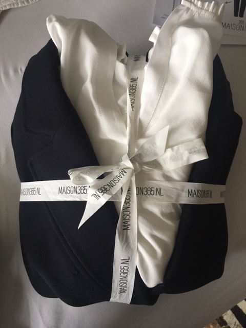 Een week later trof ik een DHL koerier voor mijn deur aan met de grote witte doos. Het voelde als een groot kerstcadeau wat ik mocht uitpakken. Ik trof 3 setjes aan en een lief beauty cadeautje. Deze blouse gecombineerd met mooie witte broek en donker blauw getailleerd jasje, met merken als Sandro, Hugo Boss en Jigsaw.