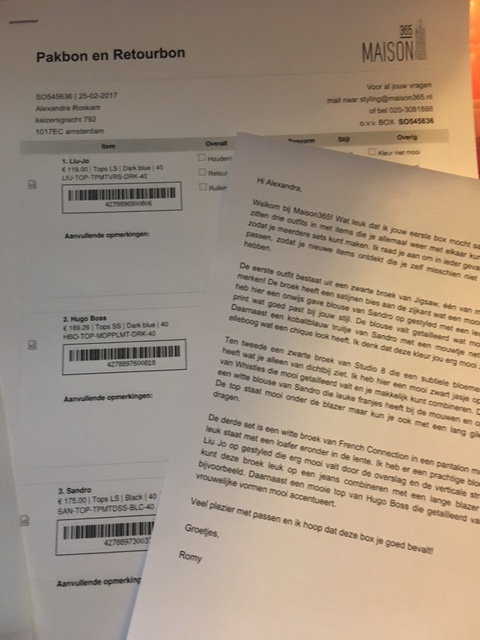 Het werkt heel eenvoudig. Alles wat je niet wilt hebben gaat meteen retour. Je kruist op de pakbon aan wat je retour wil sturen ( wel duidelijk de reden vermelden) en de kledingstukken waar je direct fan van bent, laat je thuis en reken je later via Ideal af. Een koerier komt kosteloos op een afgesproken datum de doos weer ophalen. Je betaald alleen voor de kledingstukken die je wilt houden. In mijn geval de Sandro blouse. Er zitten geen service, verzend of retourkosten aan verbonden. En zeker geen abonnement.