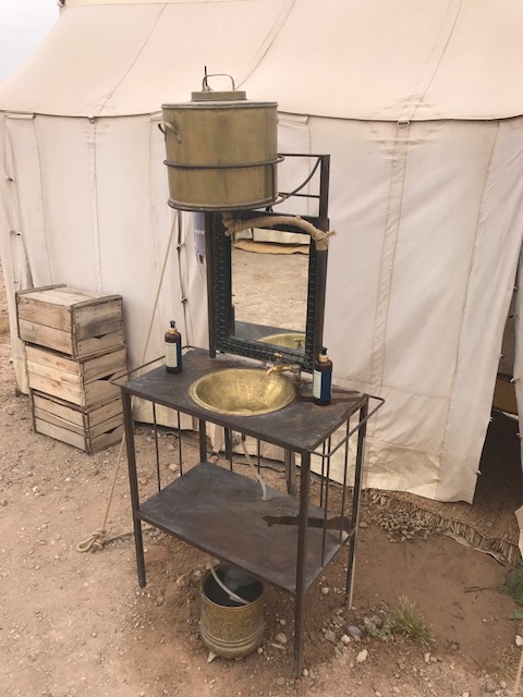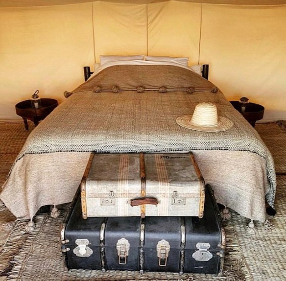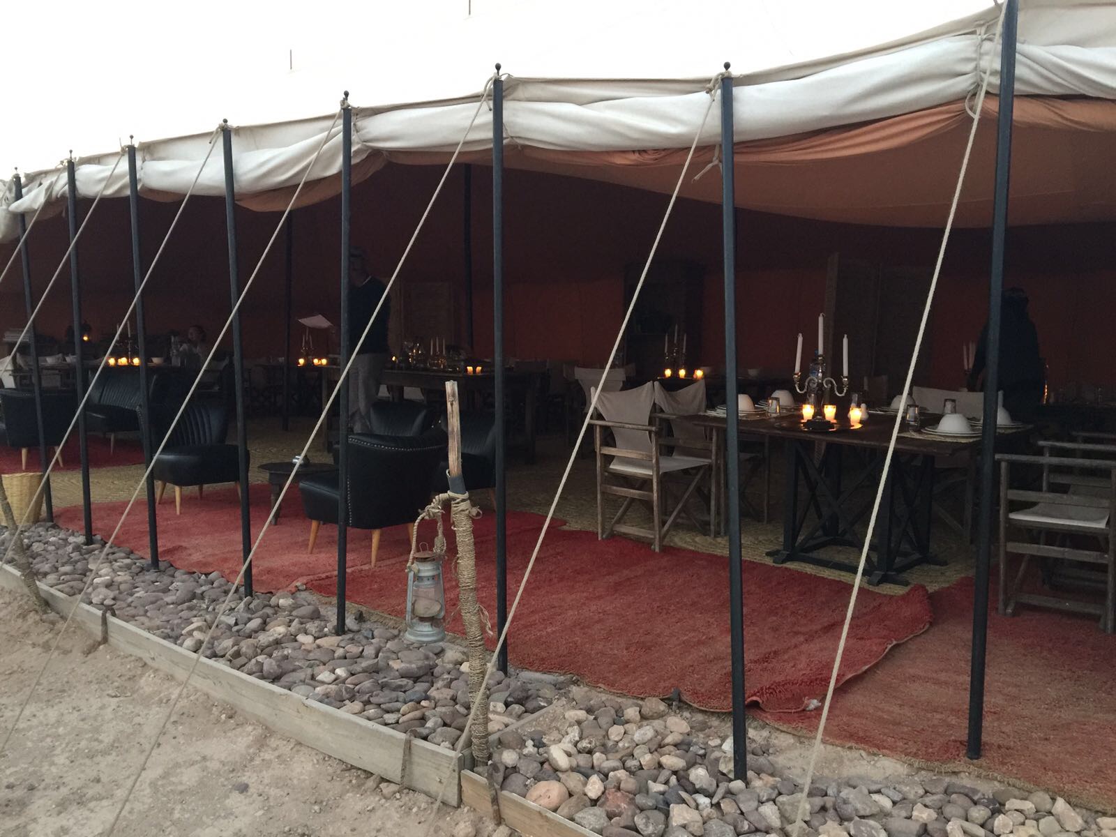 De tenten zijn van binnen spectaculair te noemen. Heerlijke bedden gestyled met prachtige sprei’s met grote pompommen er aan. Op ieder bed ligt een rieten hoed die je de volgende dag tegen de hitte van de woestijn beschermd. Iedere tent heeft zijn eigen kleine badkamertje met een septic tank wc en piep douche met spiegel. Overal in alle hoeken staan prachtige lantaarns. Er moet een mannetje van het licht zijn die iedere avond de honderden lantaarns naar je tent, een prachtig verlicht sprookjes achtig pad aansteekt. Ook de diner tent ziet er fantastisch ingericht uit. Het enige wat nog miste was zwoele zachte Arabische muziek.