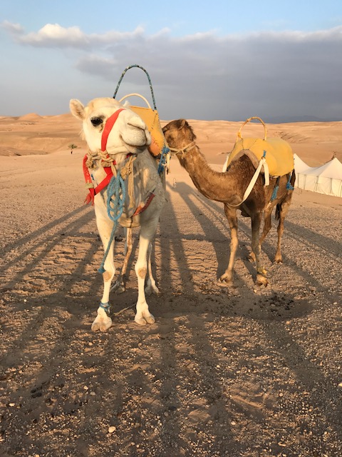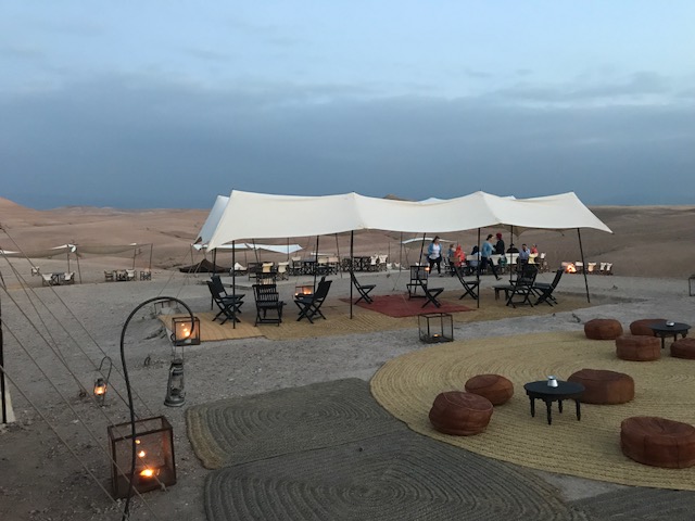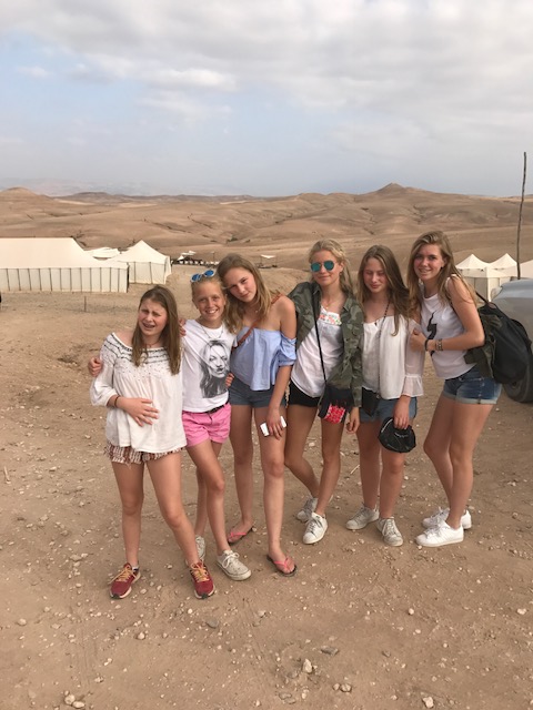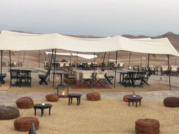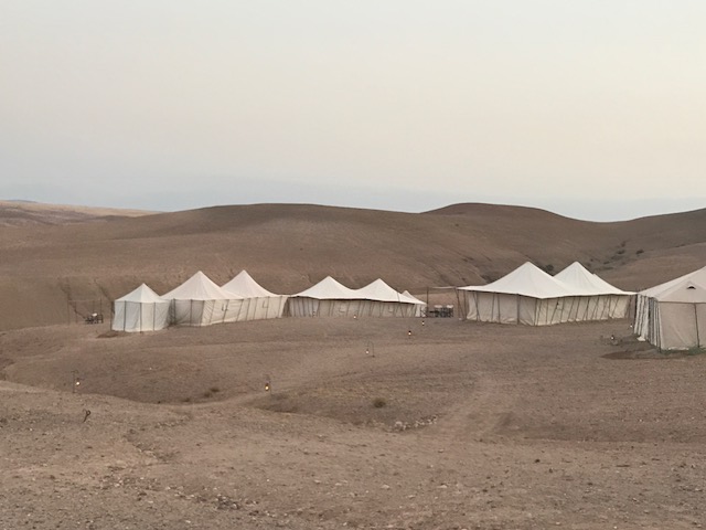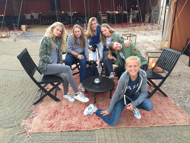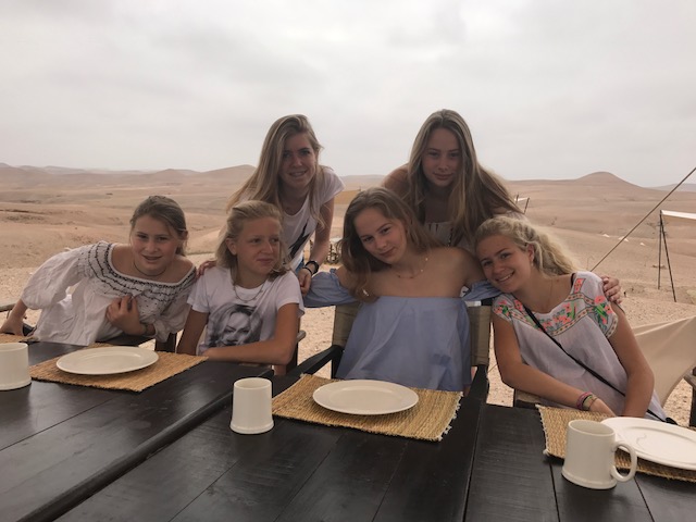 We werden welkom geheten met de traditionele Marokkaanse munt thee, die met een sierlijke boog wordt ingeschonken. We genoten van de munt thee maar na twee glaasjes van dit mierzoete spul, hadden we iets meer zin in een koud biertje of een verfrissend wijntje na de lange reis. Dat was dus even niet het geval. Het personeel meldde ons terloops dat de ramadan begonnen was en dat alcohol gedurende ons verblijf helaas niet mogelijk was. Dat was toch wel even een dompertje voor ons volwassenen. Een verplichte alcohol detox? Kon niemand ons dat even vertellen dan waren we op Schiphol nog even los gegaan. Ook de kinderen hadden het zwaar. Er was geen wifi in het kamp en ook was het niet mogelijk om hun telefoons in de tent op te laden. Dit ging via een generator in de receptie tent. Wat een rust was dat. Kinderen die als vanouds spelletjes aan tafel gingen doen en het kamp verkennen. Overigens hadden wij diezelfde avond al iemand gevonden die medelijden met onze verplichte alcohol detox had. Waarom moeten toeristen zich aan ramadan regels houden?) en hij kwam ons na het eten, rond 23u twee heerlijke flessen wijn langs brengen.
