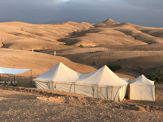 Het leek me zo’n romantisch idee om mijn man voor ons 15-jarig huwelijk ( tegenwoordig een hele prestatie) te verrassen met een lang weekend zinderend Marrakech. Aangezien dit al onze vierde keer Marrakech was, koos ik niet voor een hotel in de Palmeraie of een riad in de Medina, maar ik wilde dit maal ontspannen in een oase van rust. Scarabeo Stone Desert Camp in de Agafay woestijn, op 45 minuten rijden vanaf de stad. Het moderne glamping. Ook verbleven we niet met z’n tweeën maar mochten drie dochters en een goed bevriend ander gezin van ons love weekend meegenieten.
