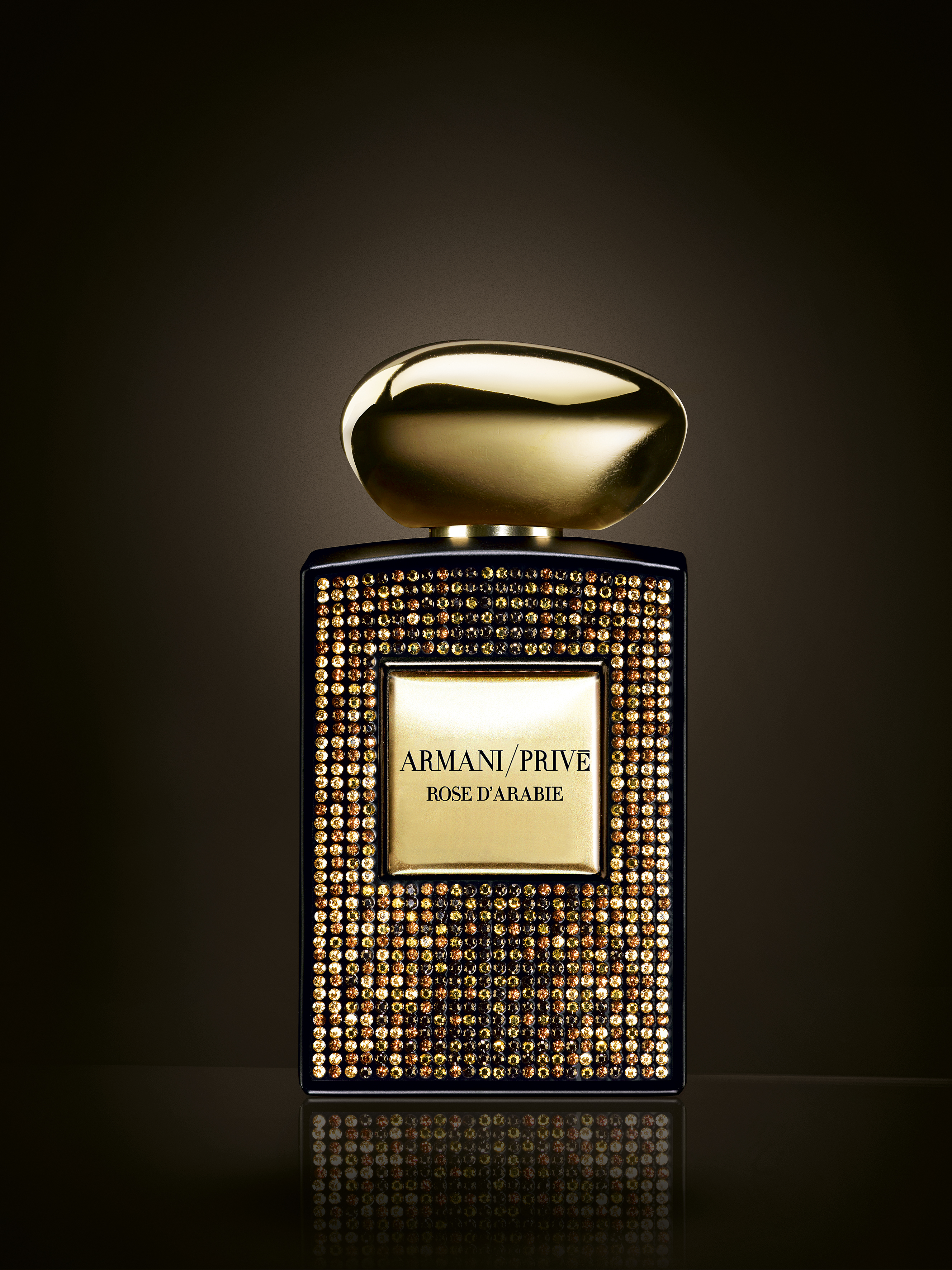 Dit is de week dat ik nog even snel doorkom met prachtige cadeautjes (geuren) voor onder de kerstboom. Dan kan het bling bling gehalte voor mij nooit te hoog te zijn. Giorgio Armani gebruikte al eerder Swarovski kristallen, voor zijn jurken en nu dus voor zijn 3500 stuks collector item flacons van ROSE D’ARABIE geur. Het is dus niet een flacon die je even in je tas meeneemt, maar eerder in je boudoir neerzet. De perfect afgewerkte kristallen verfraaien een zijde van de zwart gelakte flacon bekroond met een gouden dop.