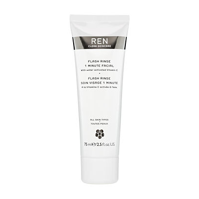 Voor alle druk bezette dames onder ons, REN heeft een heel fijn product uitgebracht dat binnen, tadaaa.. 1 minuut je gezicht veranderd. Een doffe huid wordt binnen 1 minuut een steviger, egalere en gladdere huid. Het vermindert meteen tekenen van vermoeidheid. Het wondermiddel heet: REN Flash Rinse 1 minute Facial. Het is een gel, die je aanbrengt op de huid. Daarna masseer je hem enkele seconden in voordat je er water aan toevoegt. Het water activeert de gel en vitamine C komt vrij en wordt in de huid gemasseerd.